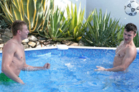 Danny is again following his devious path; Splashing around in the pool with Justin and as he gets out Justin pulls down Danny’s boardies and a nice semi pops into view! Justin then proceeds to take advantage of the situation and touches and rubs Danny’s body and his semi just gets more semi! Not a shy boy, Justin dives down and sucks Danny who is now at full mast stood on the steps of the pool! Justin just gets more devious and cant take his eyes off Danny or Danny’s cock out of his mouth! Danny gets all horny and plays with Justin’s cock; Justin gets even hornier and bends Danny over for a right good rimming! So all this tension and its not long before Danny is dumping his load on Justin’s chest; Danny hardly touching his own cock this shoot, he certainly has learnt how to let Justin take the lead! Click here to see the shoot
