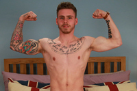 Patrick is a young man who plays football and goes a lot to the gym and as a result has one of those ripped bodies with nice size muscles and the odd tattoo! He has started to enjoy showing off his body, as he strips and steps out of his boxers, his uncut cock rises up into a very stiff erection! One of those cocks that can’t move once he is hard, since it’s just solid! Patrick enjoys showing off his body, is pretty hair free, only a little on his legs and hardly any round his hole! After showing off his body he lies back and pumps his cock real hard and gushes a nice load of cum over his abs! Great job Patrick, you wank as well as you sing! Click here to see the shoot