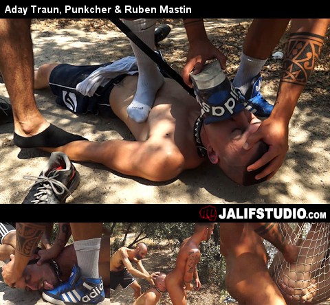 Boomer Banks and Cass Bolton sniff and lick, both gravitating towards each other’s armpits. They are both tall and athletic, but Cass is pale and freckled compared to Boomer’s darker skin, covered in ink. Boomer’s cock is the ultimate challenge to Cass’ sucking skills, and the cords of his neck stand out as he tries to swallow more and more. Boomer shows no mercy, fucking Cass’ face and making his eyes tear. Cass gets a break when Boomer wants his foreskin played with. Cass’ chest and pubes are covered with crisp red hairs that match his beard. He and Boomer make out, and Boomer sucks his cock, having no trouble swallowing it. Nuzzling the hole, tonguing it, and massaging it with his thumb, Boomer turns his attention to Cass’ crack. Boomer lies on his back and Cass slowly lowers himself onto Boomer’s rock-hard 10′ cock. They pound into each other from opposite directions, rattling the table and slamming their nuts together. Boomer feeds his massive load to Cass, who sprays his seed across the floor as he swallows.